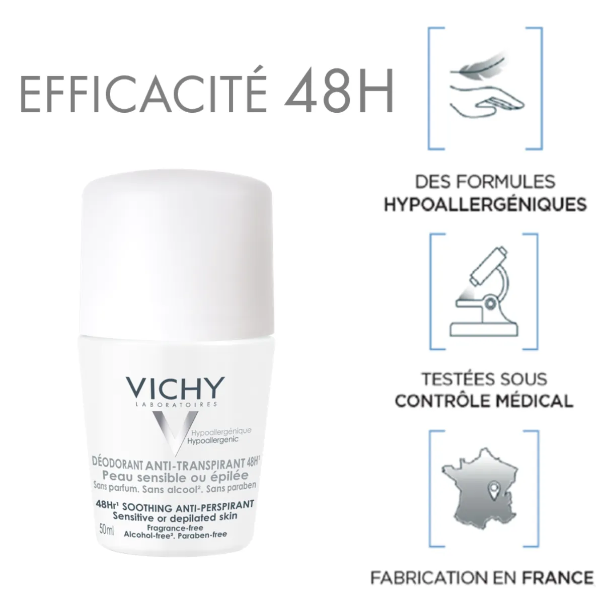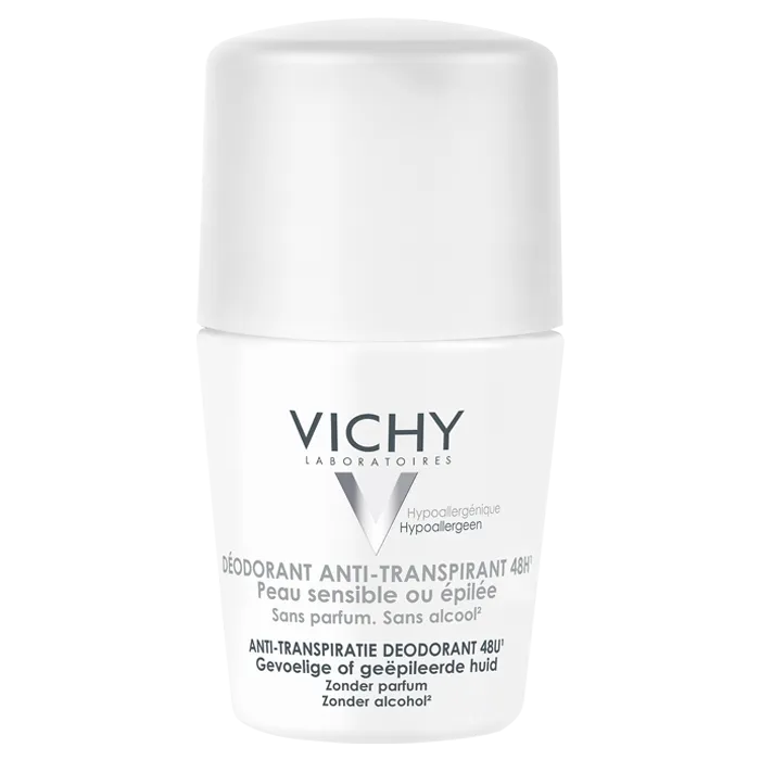 Le Déodorant anti-transpirant 48h Peau sensible ou Épilée de VICHY est composé de Proline Cutei, de complexe aminé d’origine végétale, apaisant, anti-irritations pour soulager rapidement les irritations, même après épilation.Hypoallergénique A l’Eau Thermale de Vichy Fabriqué selon des principes stricts de l’industrie pharmaceutique. Efficacité testée sous contrôle dermatologique.